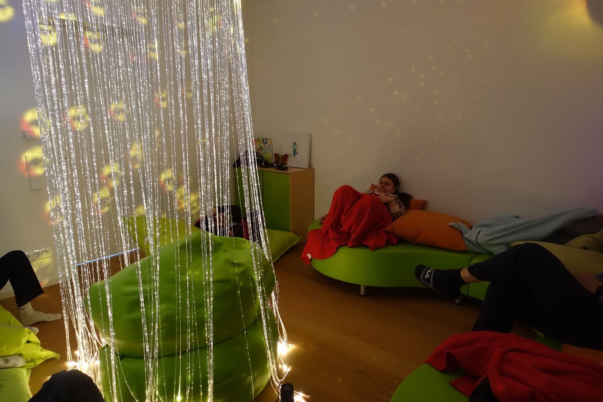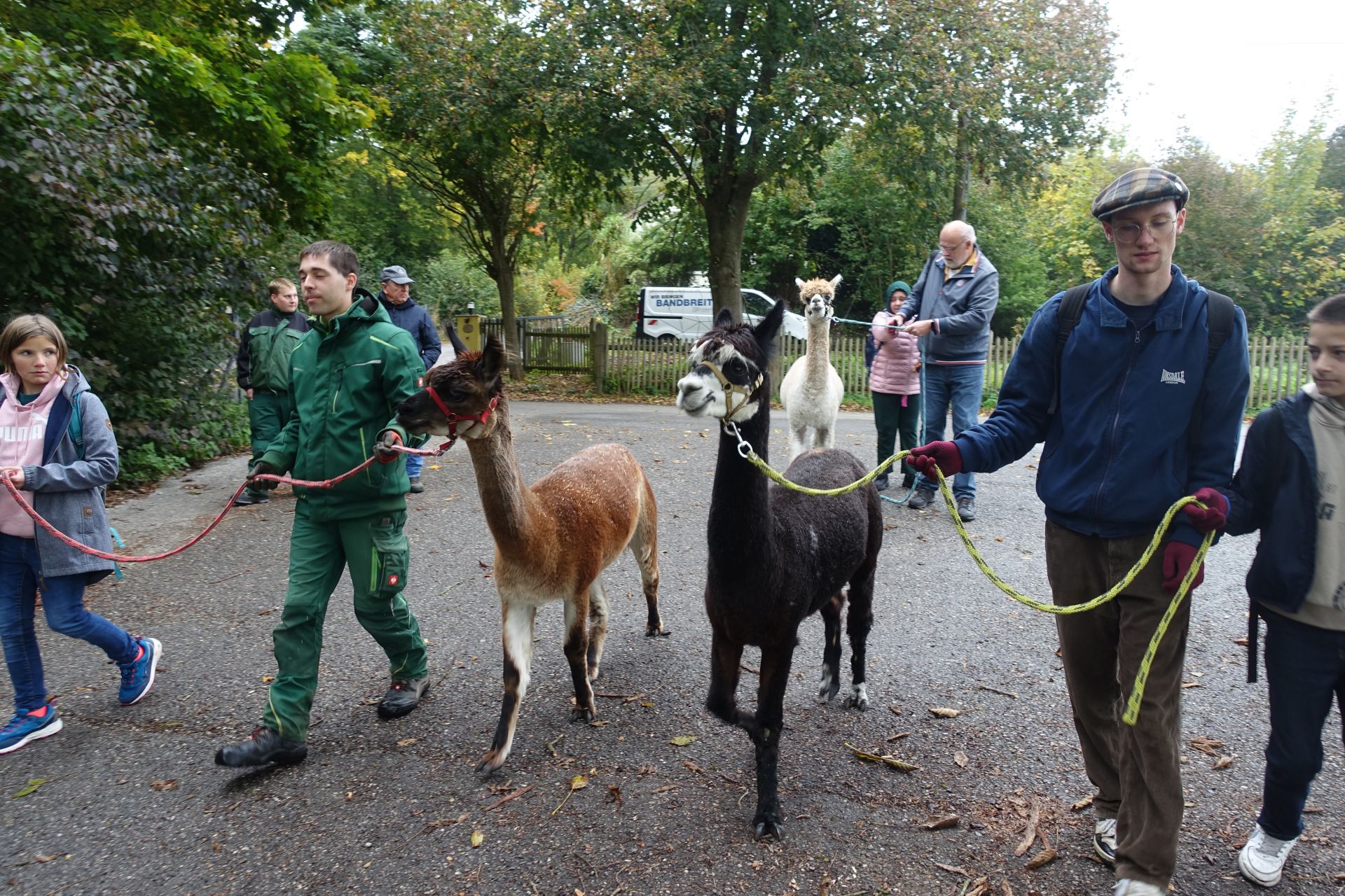 An einem Tag kam ein Musiktherapeut und hat mit uns Musik gemacht und gesungen. Außerdem durften wir mit den Alpakas der Stiftung wandern gehen.